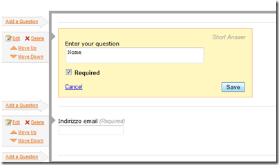 Si può mettere il segno di spunta se si vuole rendere obbligatorio il dato. Per aggiungere altri dati si clicca su Add a question. Cliccando invece su Move up o Move Down si sposta l'ordine delle domande. Possiamo anche inserire un form per specificare il sito di chi ci invia il messaggio. In questo caso mettiamolo senza spuntare Required e quindi non obbligatorio. Adesso inseriamo il campo con il testo da inserire e che il lettore del nostro blog ci vuole inviare.