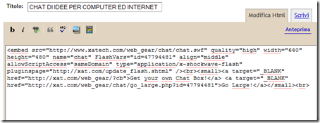 Dopo aver copiato ed incollato in un documento di testo il codice, andiamo ad inserirlo nel blog. Si potrebbe inserire in homepage ma prende troppo spazio, quindi sfruttiamo un post che abbiamo retrodatato, poniamo al 10/01/2008 prima cioè della nascita del blog, e che chiameremo CHAT DI IDEE PER COMPUTER ED INTERNET. Nel corpo del post, con la modalità HTML, inseriamo il codice della chat appena acquisito. Infine pubblichiamo