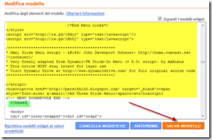 Adesso potete intervenire sul modello e andate su Layout > Modifica HTML, salvate il modello completo e espandete i modelli widget. Cercate la riga di codice che indica la fine della testa della pagina cioè il tag </head>. Immediatamente sopra incollate il seguente nuovo codice, come mostrato in questo screenshot