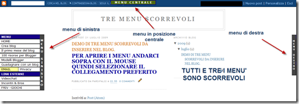 Ho ricevuto una richiesta in un comento di adattare degli script presenti in rete alle esigenze di un blogger italiano che volesse inserire ben tre menù scorrevoli nel proprio sito.Per prima cosa date uno sguardo al blog di prova che ho creato per testare questa funzionalità