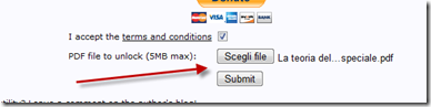 PDF Crack funziona in modo simile, è assolutamente gratuito, non necessita di registrazione, occorre Accettare i Termini e Condizioni e la dimensione massima dei file da sbloccare è di 5MB. Si tratta comunque di un limite elevato visto che intuitivamente arriva a sbloccare documenti di 300-500 pagine. Si seleziona il file dall'hard-disk e ci clicca su Submit.