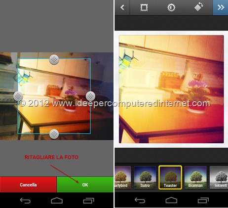 Le foto importate possono essere ritagliate mediante un rettangolo con maniglie configurabile con due dita. Si clicca su OK quando ci si ritiene soddisfatti. L'immagine così ritagliata si aprirà quindi nell'Editor di Instagram dove, nella parte bassa sono applicabili, e di cui si può vedere immediatamente l'anteprima, tutta una serie di effetti grafici: Normale, Amaro, Rise, Hudson, Sierra, X-Pro, Lo-Fi, Earlybird, Sutro, Toaster, Inkwell, Walden, Hefe, Valencia, Nashville, 1977 e Kelvin.