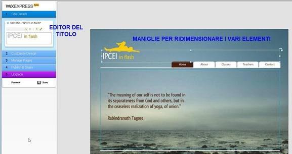 In Site Details si digitano Titolo e Sottotitolo del sito con un apposito editor. Mediante l'uso del cursore si può ridimensionare e spostare ciascun elemento. In Custom Design è possibile scegliere il colore di sfondo e l'immagine di background. Si va su Replace e si seleziona il file prescelto dopo aver cliccato su My Image > Upload Image. Sono anche disponibili una vastissima quantità di foto in Wix Collection suddivise per categorie che vanno dagli animali alla moda, dal business al cibo.