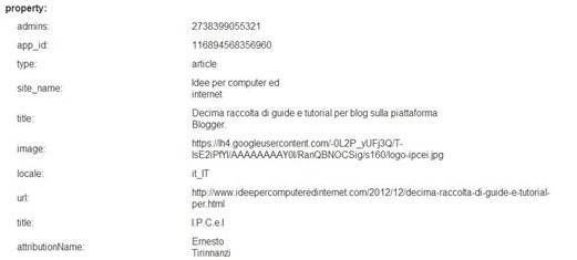 Nella sezione Autore si vedrà se sia stato verificato o meno il Profilo dell'autore della pagina mentre nella sezione Editore se sia stata collegata la pagina brand di Google Plus. Scorrendo il tool si potranno visualizzare ulteriori informazioni sui dati strutturati e se fossero presenti degli errori. C'è da dire che non occorre inserire tutti i microformati ma solo quelli obbligatori. Un errore abbastanza comune è quello del campo Missing Required Field Update. Nella parte bassa della pagina in Property si potranno visualizzare i dati associati a ciascuna pagina di cui si sia monitorato l'URL. Nello screenshot sottostante si può vedere come sia stato anche rilevato l'ID della applicazione Facebook