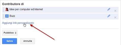 per poi digitare nome e URL del sito nei due campi che si aprono. Si va ovviamente su Salva per terminare l'inserimento del link. Possiamo aggiungere tutti i siti che possediamo che poi saranno visualizzati nel nostro Profilo accanto a Contributore di e sotto a Altri Profili.