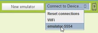 Le tre schede Built-in, My Blocks e Advanced contengono tutte le possibili combinazioni da usare per unire i componenti della applicazione. Le sezioni di Built-in saranno visualizzabili anche nell'area di lavoro quando sarà necessario inserire una di queste variabili: Definizione, Testo, Elenco, Math, Logic, Controllo e Colori. Quando abbiamo ultimato il lavoro c'è l'esigenza di testare l'applicazione su un telefonino. Andiamo nel Block Editor su New Emulator e aspettiamo un paio di minuti per la configurazione. L'emulatore sarà pronto quando si vedrà una immagine come questa