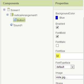 Screen Arrangement è un tool che serve per allineare in senso orizzontale o verticale alcuni elementi della applicazione. Se per esempio trasciniamo tre bottoni all'interno di HorizontalArrangement questi saranno visualizzati in orizzontale. E' disponibile anche l'opzione TableArrangement per disporre i contenuti in una tabella. Sono possibili molte altre aggiunte tra le quali il Bluetooth, il Riconoscimento vocale, il TextToSpeech e naturalmente il Web che permette di inserire URL di pagine, proprietà, eventi e metodi. Nello screenshot precedente ho inserito una immagine e un file audio MP3. Nella sezione Components si visualizza tutto quello che si è inserito. Se selezioniamo un componente, nella colonna denominata Properties potremo modificarne l'aspetto.