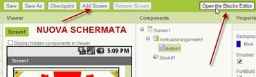 riguardo al background, alle dimensioni delle immagini, al tipo di carattere e altro ancora. Per creare una nuova schermata della applicazione bisogna andare su Add Screen e aggiungere i nuovi componenti con la stessa procedura. I vari elementi debbono essere collegati associando eventi a azioni conseguenti. Facendo l'esempio dello screenshot quando si tocca il bottone con l'immagine deve partire la riproduzione di un suono. Si va su Open the Blocks Editor