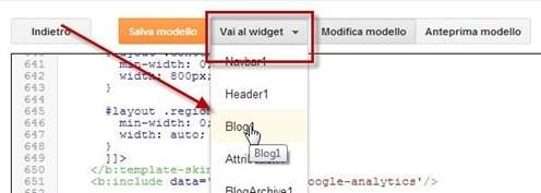Sempre su Modello > HTML adesso si clicca su Vai al widget > Blog1
