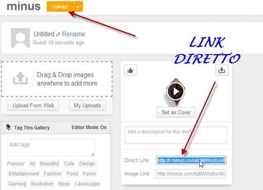 Le foto possono essere taggate e si può inserire anche una descrizione. Per ciascuna immagine caricata ci verrà dato oltre al link della pagina anche il link diretto o hotlink o direct link in modo da poterlo usare volendo per pubblicarla in un sito mediante un codice come questo
