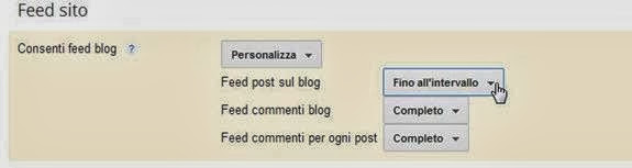 Con Completo viene mostrato tutto l'articolo mentre con Nessuno si impediscono i feed. La scelta Breve mostrerà solo pochi caratteri dell'articolo mentre Fino all'intervallo inserirà nei feed la parte dell'articolo prima del Read More. Con questa scelta l'articolo sarà visibile nella sua formattazione originale anche con le immagini che eventualmente siano state inserite prima dell'intervallo. Con Personalizza si possono settare non solo il feed dell'articolo ma anche i feed dei commenti. In questo blog ho scelto questa configurazione