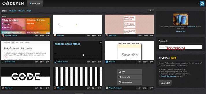Come funziona CodePen l'Editor online HTML, CSS e Javascript per testare il codice e avere la demo del risultato visivo.