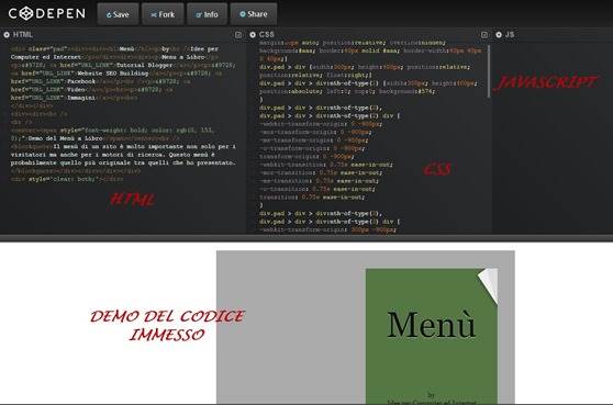 Andando invece su Fork si può copiare il Pen corrente per poi visualizzarlo nel nostro account e modificarlo a piacere. Per maggiore chiarezza ho realizzato un Pen con il codice del Menù Colorato ruotante che può essere aperto in queste due pagine