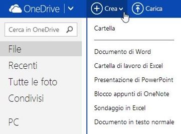Nel primo caso si va su Carica mentre nel secondo si sceglie Crea che aprirà un menù che oltre alla creazione di una Cartella ci permetterà di iniziare a editare un Documento Word, una Cartella di lavoro Excel, una Presentazione PowerPoint, un Blocco di Appunti OneNote, un Sondaggio in Excel o un Documento di semplice testo .txt. Se si vuole inserire o creare un documento in una particolare cartella questa operazione dovrà essere fatta dopo che sia stata aperta