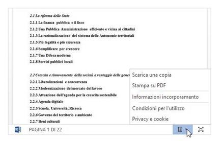 Ci saranno due icone di controllo poste in basso. La seconda servirà per aprire il documento a tutto schermo mentre la prima se cliccata mostrerà il menù per scaricarne una copia, per convertirlo in PDF prima della stampa, per incorporarlo, per visualizzare i termini di utilizzo oltre a privacy e cookie. Gli screenshot sono relativi alla modifica e alla creazione di un documento Word ma la procedura è sostanzialmente analoga per uno Excel e uno PowerPoint. I file saranno visualizzati in una griglia e basterà cliccarci con il destro del mouse per aprirlo, modificarlo, incorporarlo e eliminarlo