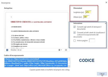 Oltre al codice sarà visibile anche l'anteprima del documento con le dimensioni e le interazioni che saranno consentite ai lettori che lo visualizzeranno
