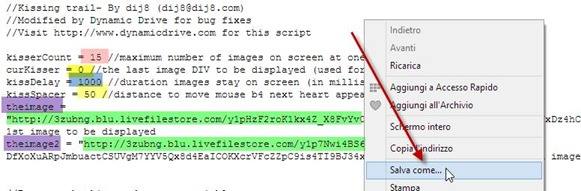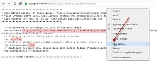 I javascript degli effetti sono stati caricati su Google Drive tramite la sua funzione di Hosting. Si possono personalizzare alcuni parametri scaricando i file. Per prima cosa incollate uno degli URL colorati di rosso nel browser e andate su Invio. Si visualizzerà il file che potrà essere scaricato andando sul destro del mouse e selezionando Salva come…