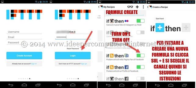 In aggiunta ai canali già conosciuti nella versione desktop ce ne sono altri specifici del cellulare Android o iPhone. Per esempio si può creare una formula per farsi mandare per email le foto scattate con il nostro cellulare in modo da averle subito disponibili nel computer. Si può accedere a IFTTT con le stesse credenziali del desktop. Per creare una formula o ricetta si parte dalla frase If This Then That che è servita per l'acronimo di IFTTT. Nel caso si verifichi un certo evento allora si imposterà un determinato effetto. IFTTT in sostanza crea delle connessioni tra i nostri canali. Per il momento latita Google+ ma gli altri ci sono tutti. La formula di IFTTT può essere quindi creata e attivata anche da mobile