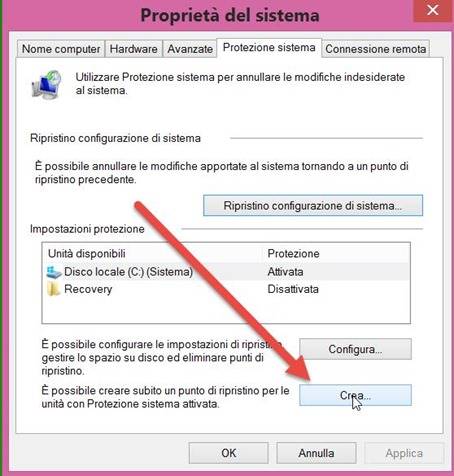 e si clicca su Crea per creare un punto di ripristino delle impostazioni correnti. Nel campo successivo si digita il nome del punto di ripristino a futura memoria e si clicca su Crea.