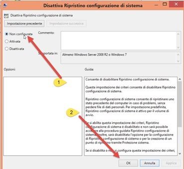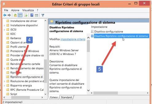Si clicca su Configurazione computer > Modelli amministrativi > Sistema. Adesso si scorre fino a trovare la cartella Ripristino Configurazione di Sistema. Ci si fa click sopra e si va sulla destra su Disattiva Ripristino Configurazione di sistema. Con un doppio click si aprirà una nuova finestra