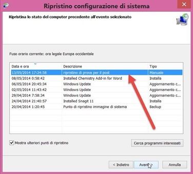 Dopo aver cliccato su Avanti non si dovrà fare altro che selezionare il punto di ripristino desiderato tra quelli disponibili creati manualmente o automaticamente
