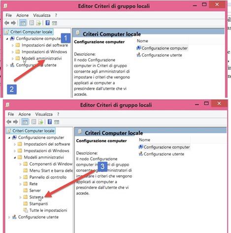 Se si ha un PC con Windows 8.1 si va con il destro del mouse sul pulsante Start e si sceglie Esegui, con Windows 7 si va su Start e si clicca sempre su Esegui. In entrambi i casi si digita gpedit.msc per andare su OK e aprire la finestra denominata Editor Criteri di Gruppo Locali