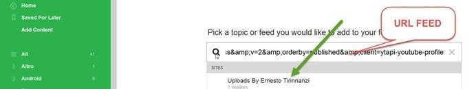 Dopo aver creato un Feed RSS di un canale di Youtube bisognerà ovviamente iscriversi per ricevere gli aggiornamenti direttamente nel lettore di Feed. Vediamo la procedura da usare con Feedly che oltre ad essere il lettore che uso io è anche quello che ha ereditato la qualifica di lettore più usato da Google Reader. Si va su Add Content e si incolla l'URL del feed del canale