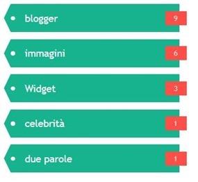 Questo widget l'ho visto nel blog vietnamita DuyPham che spesso ha idee davvero geniali. Come per tutte le personalizzazioni che coinvolgono il modello bisogna preventivamente salvare il template andando su Modello > Backup/Ripristino > Scarica modello completo. È stato scelto di visualizzare le 5 etichette con più post ma questo numero potrà essere modificato a piacere. L'aspetto del widget inserito in una sidebar potrà essere modificato anche nei colori e sarà simile al seguente