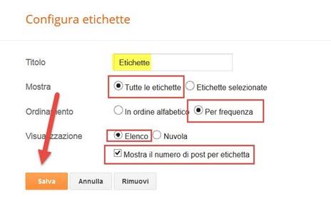 scegliendo il titolo a piacere ma selezionando le opzioni Tutte le etichette, ordinate per frequenza, visualizzate in elenco e che mostrino il numero di post per etichetta. Si va su Salva per terminare quindi si torna su Modello > Modifica HTML e si cerca il blocco di codice seguente