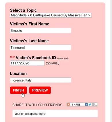 Fake a Wish ha un funzionamento diverso da Fodey. Si tratta di un sito specializzato nel diffondere notizie bufala sulle celebrities. Non occorre nessuna conoscenza tecnica. Fake a Wish ha degli articoli preimpostati con false notizie sulla morte o su incidenti di celebrità. Le numerose notizie false in tal senso apparse nei social in questi ultimi tempi derivano spesso dall'utilizzo di questo o di tool similari. Il problema per noi italiani è che supporta solo città USA e quindi è indicato solo per notizie bufala di oltre oceano. Si digita nome, cognome, città, si seleziona il genere e si va su Go