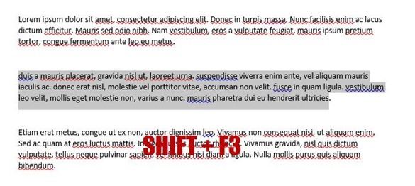 In sostanza quando un testo viene selezionato se si digita Shift+F3 questa selezione verrà alternativamente trasformata tutta in Maiuscole, con le Maiuscole all'inizio della prima parola dopo il punto o Tutta in minuscole.