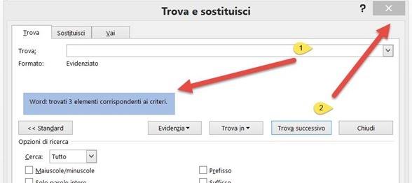 Si va in basso su Formato e si sceglie Evidenziato. Il bottone Trova in si attiverà e cliccando sulla freccetta in basso sceglieremo Documento principale.