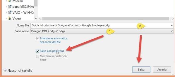 5) Salvare documenti con password - Per tenere riservato un documento all'atto del suo salvataggio si può impostare una password di accesso