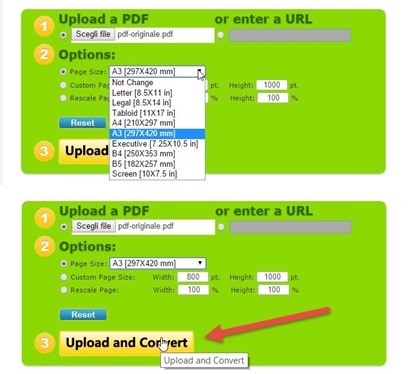Su Units si possono scegliere delle unità di misura diverse dai punti quali i pollici, i centimetri o i millimetri. Si può anche scegliere il posizionamento del PDF nel foglio che di default è "center". Si va su Scegli file e si seleziona il PDF da ridimensionare. Finalmente si va su Upload & Resize.